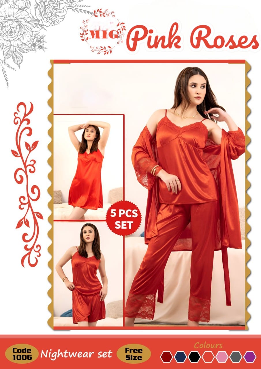5 PCS BIRDAL NIGHT SUIT NIGHTWEAR FOR WOMEN & GIRLS -- IMPORTANT SILK GSM USE -- PACK OF 5 PIECE NIGHTY INNER+GOWN+TROUSER+SHORT & BREAST SIZE EASILY WEAR -- WOMENS & GIRLS